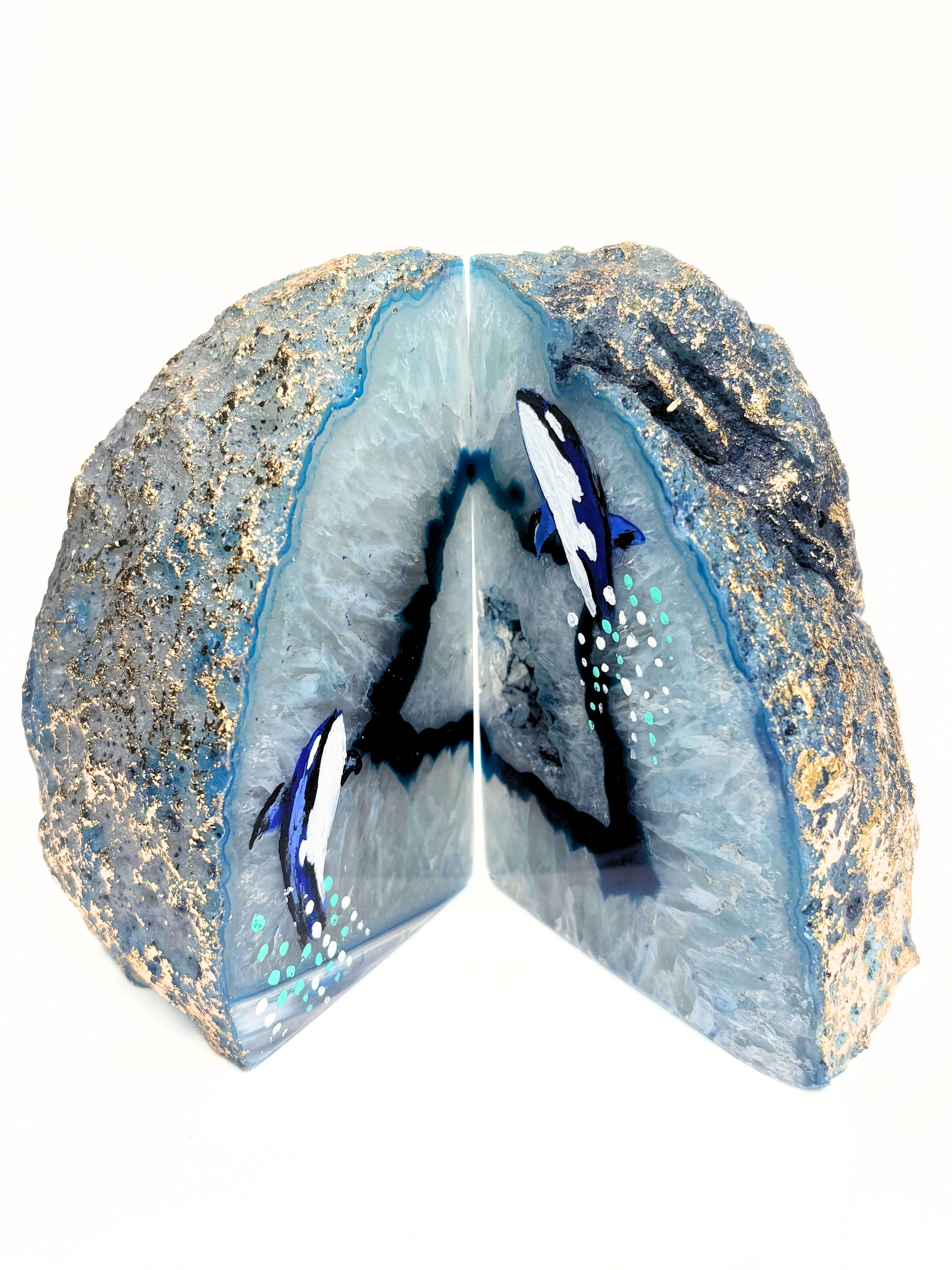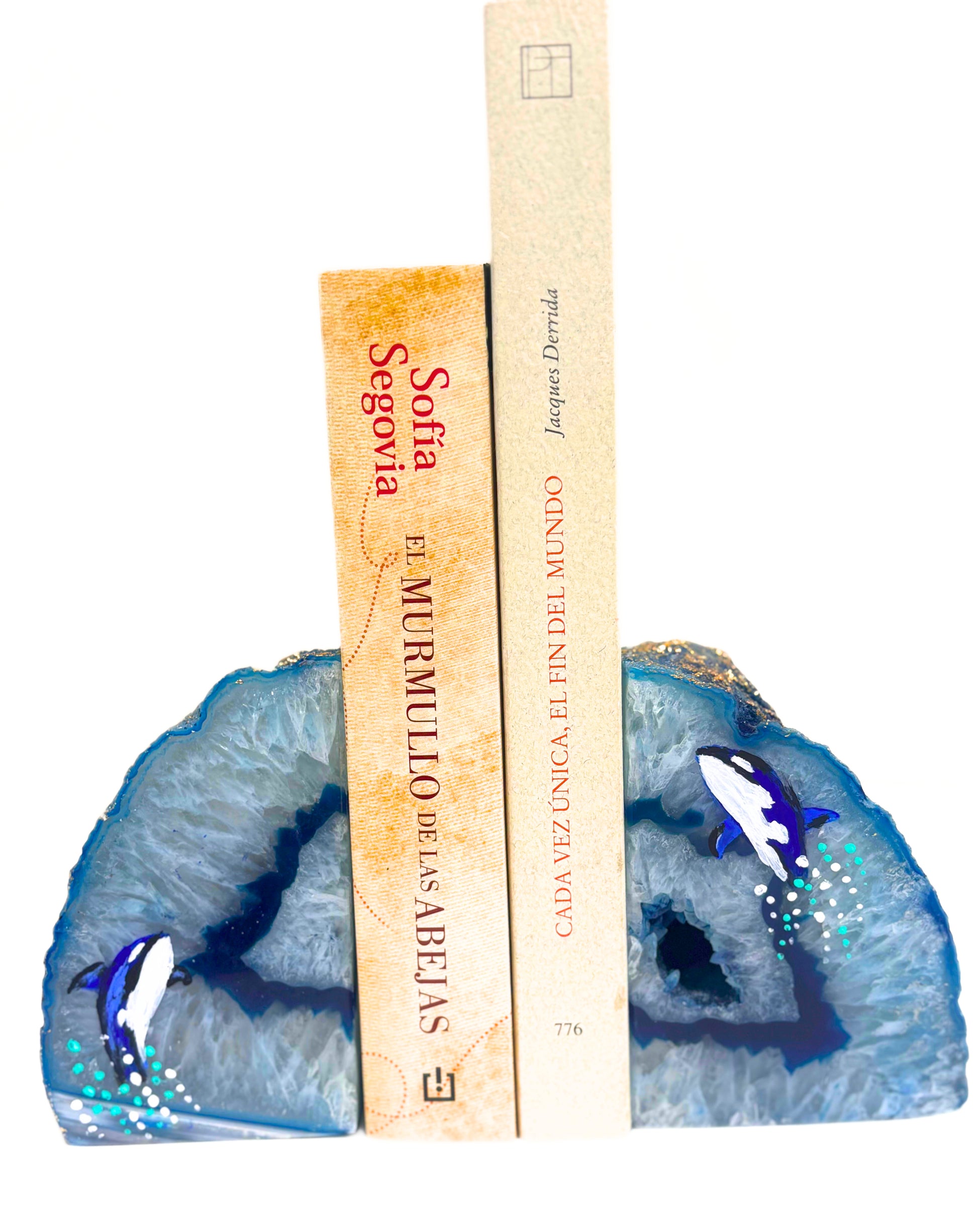Cada pieza es única: la belleza natural del ágata se combina con el detalle artístico para crear una obra decorativa que también organiza tus libros con estilo. Ideal para regalar o embellecer cualquier rincón con elegancia y color.