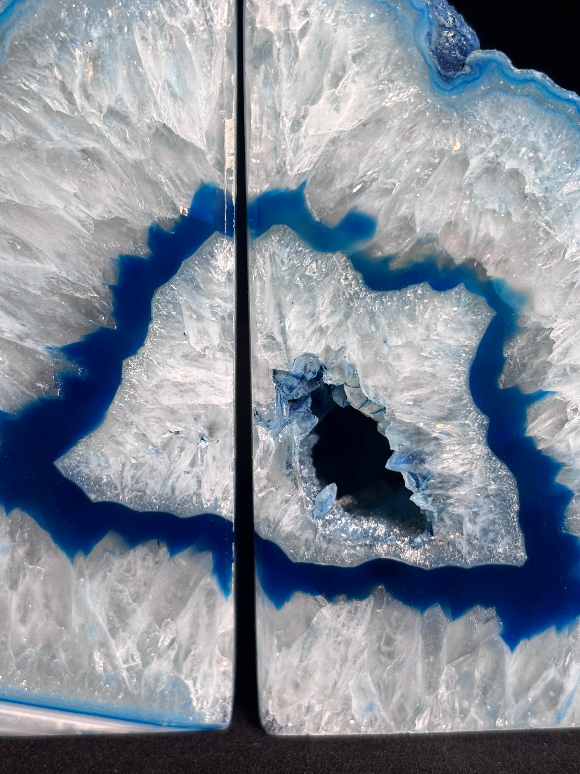 La geoda de ágata azul es una formación natural de cuarzo y calcedonia, conocida por sus patrones únicos y su suave color azul que evoca calma y serenidad. Es un tesoro escondido dentro de rocas que al abrirse revelan increíbles detalles y texturas.