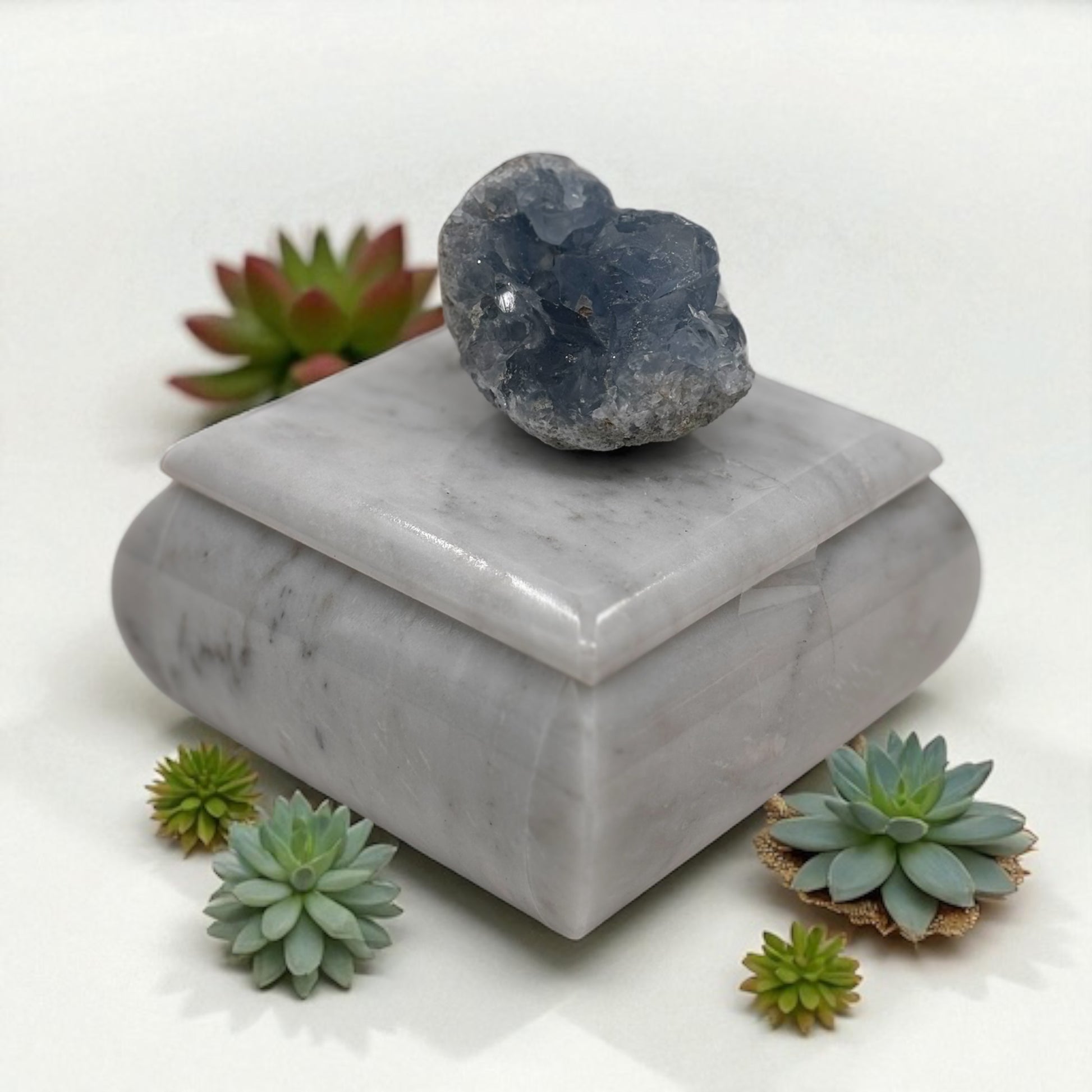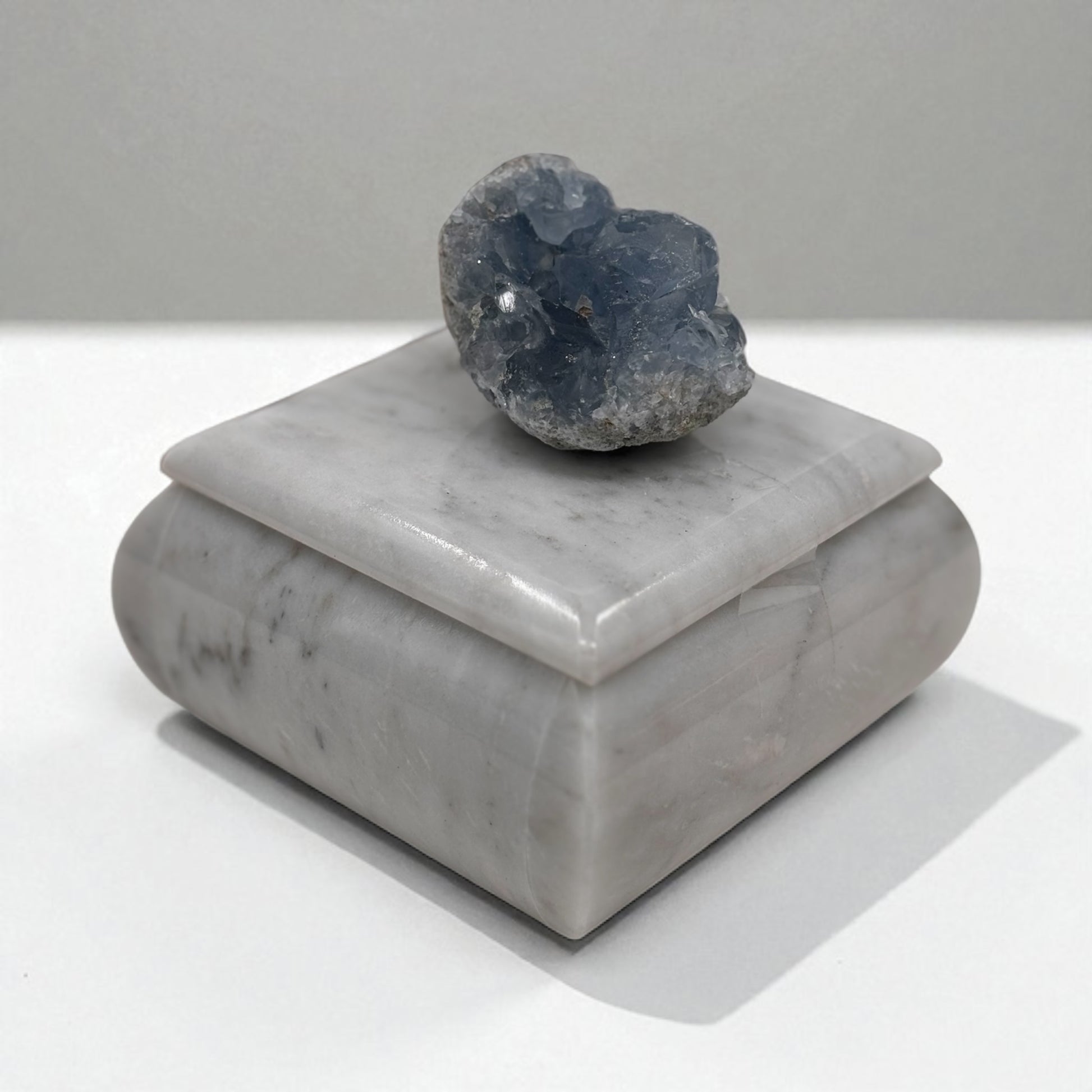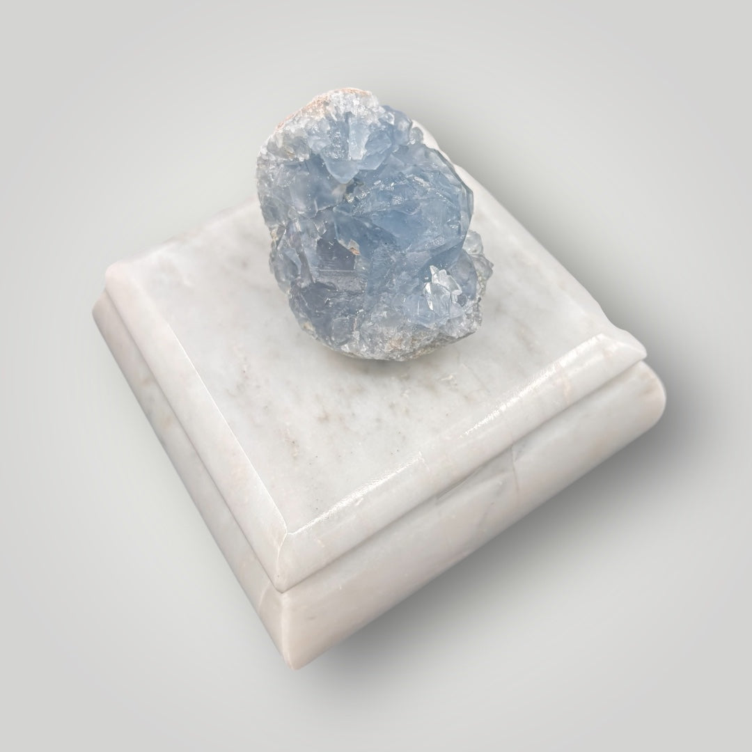Elegancia y energía natural en una sola pieza. Este alhajero de mármol pulido resguarda tus joyas con estilo, mientras que su tapa está coronada con un hermoso cuarzo celestita, conocido por sus tonos azul cielo y su energía calmante.