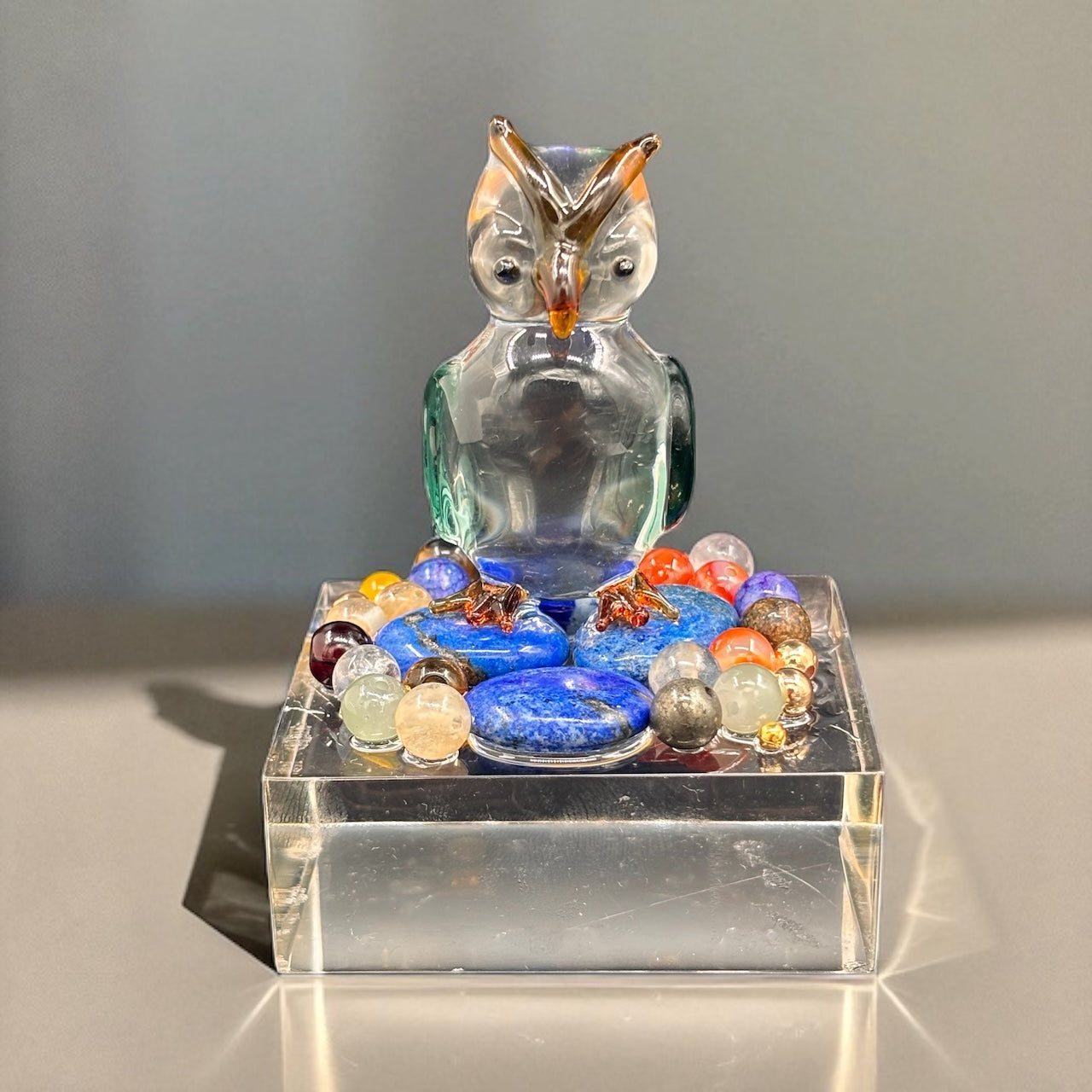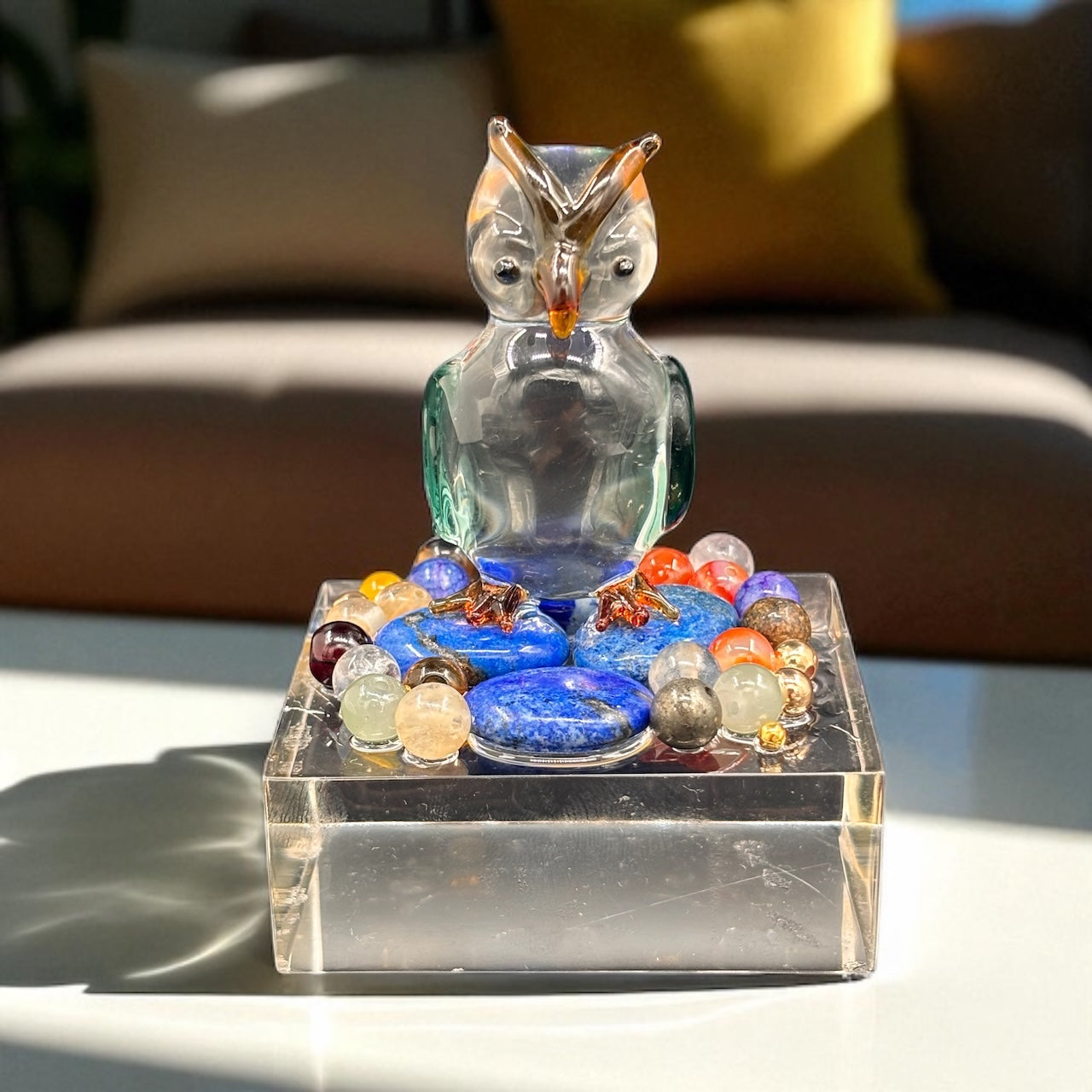 Elegante búho de cristal finamente trabajado, posado sobre lapislázuli y minerales de colores que aportan energía y protección . El lapislázuli es símbolo de sabiduría y claridad mental, haciendo de esta pieza un amuleto perfecto para el hogar o la oficina.