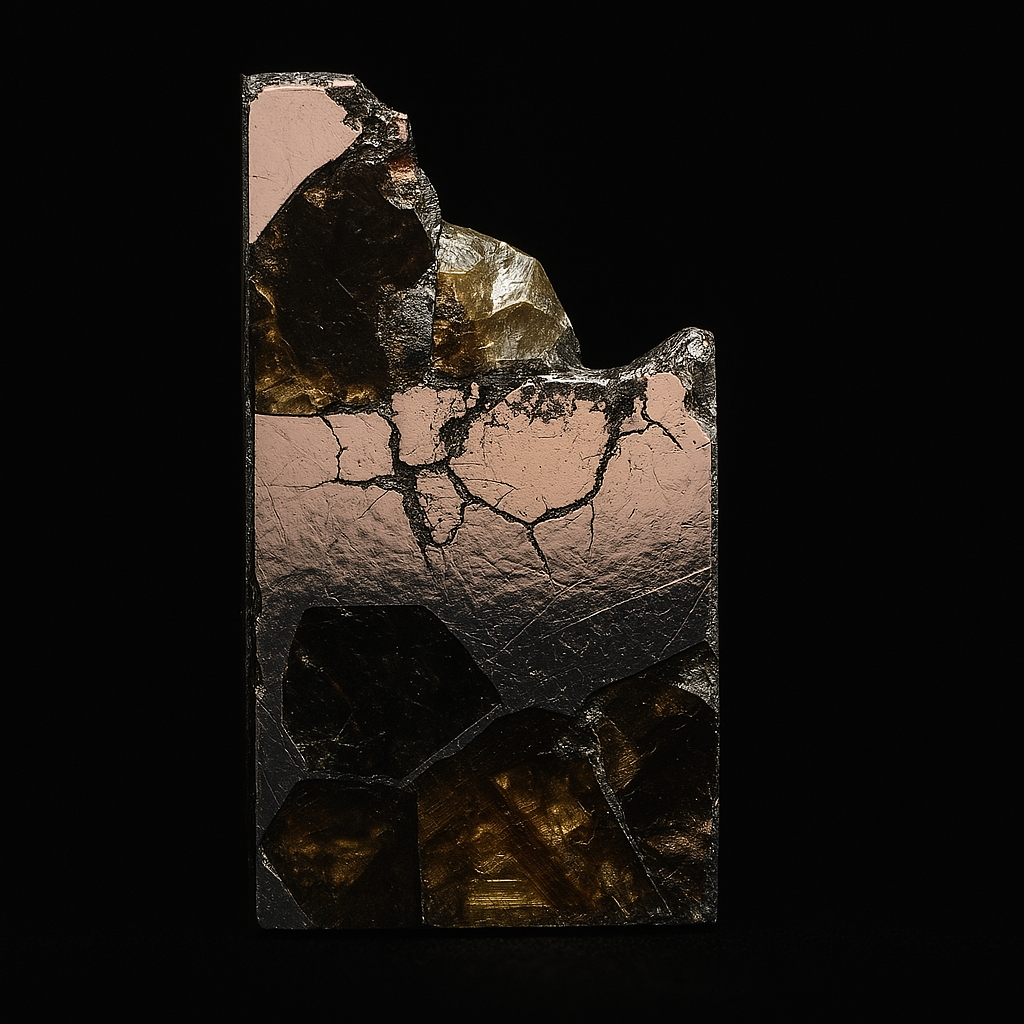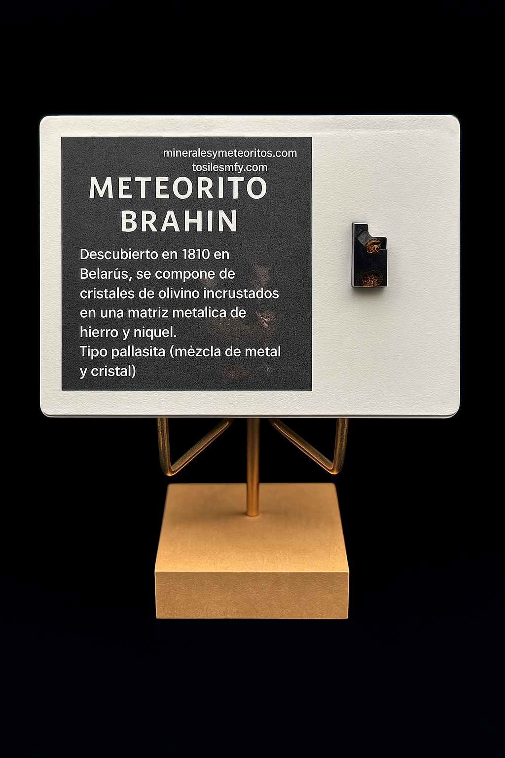 El Brahin es un meteorito pallasita, una de las clases más bellas y raras que existen. Fue descubierto en Belarús en 1810. Se compone de cristales de olivino (peridoto) incrustados en una matriz metálica de hierro y níquel, lo que le da un aspecto translúcido y espectacular cuando se corta en láminas delgadas.