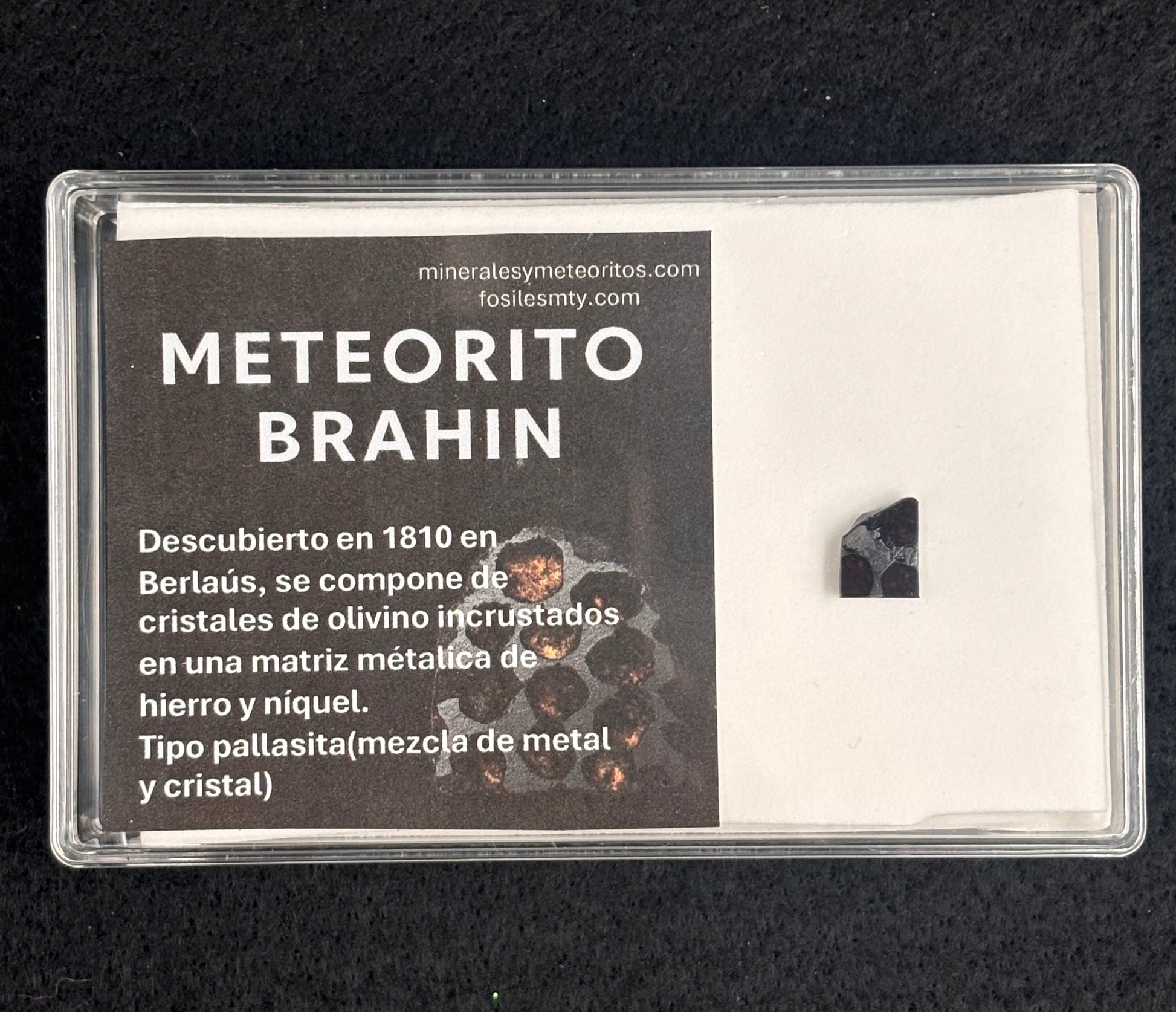 El Brahin es un meteorito pallasita, una de las clases más bellas y raras que existen. Fue descubierto en Belarús en 1810. Se compone de cristales de olivino (peridoto) incrustados en una matriz metálica de hierro y níquel, lo que le da un aspecto translúcido y espectacular cuando se corta en láminas delgadas.