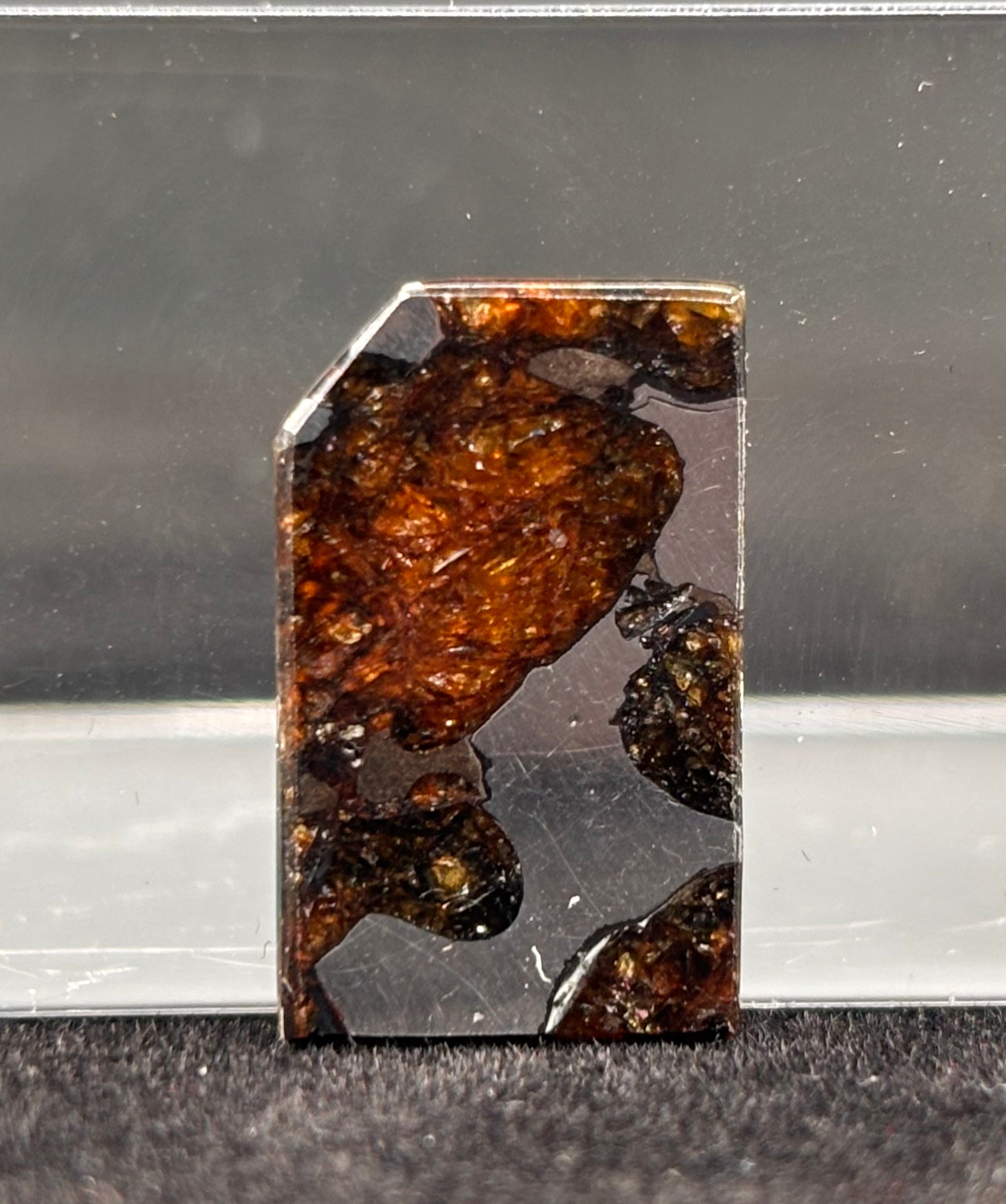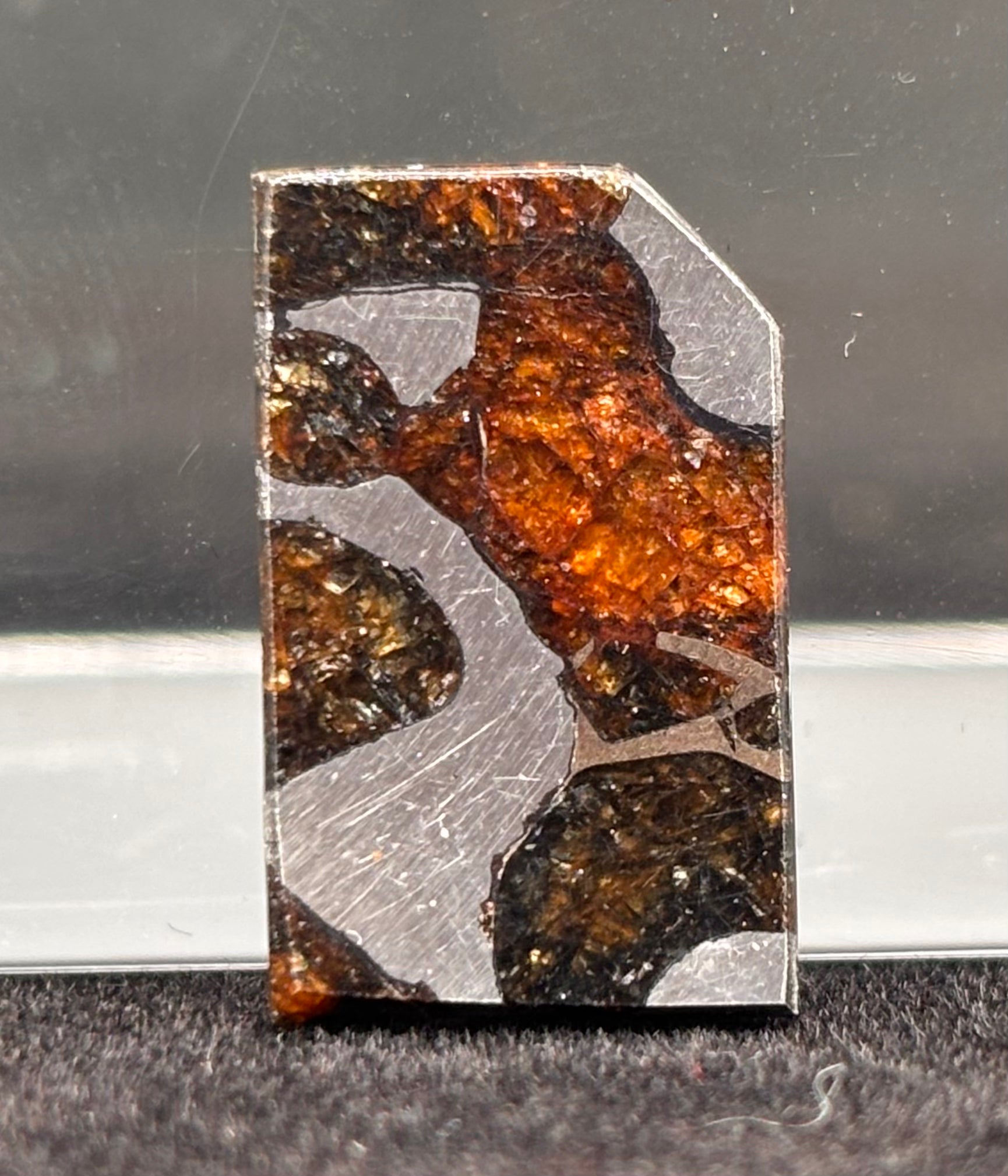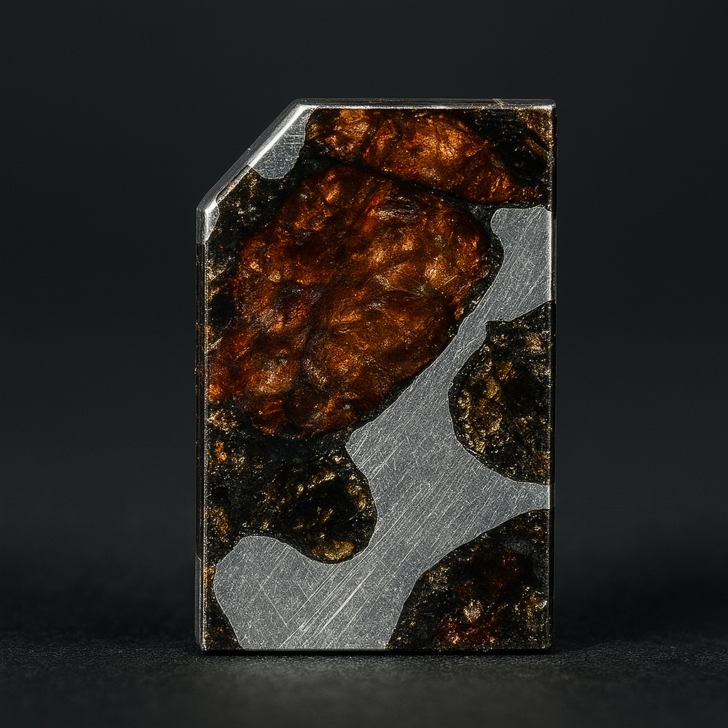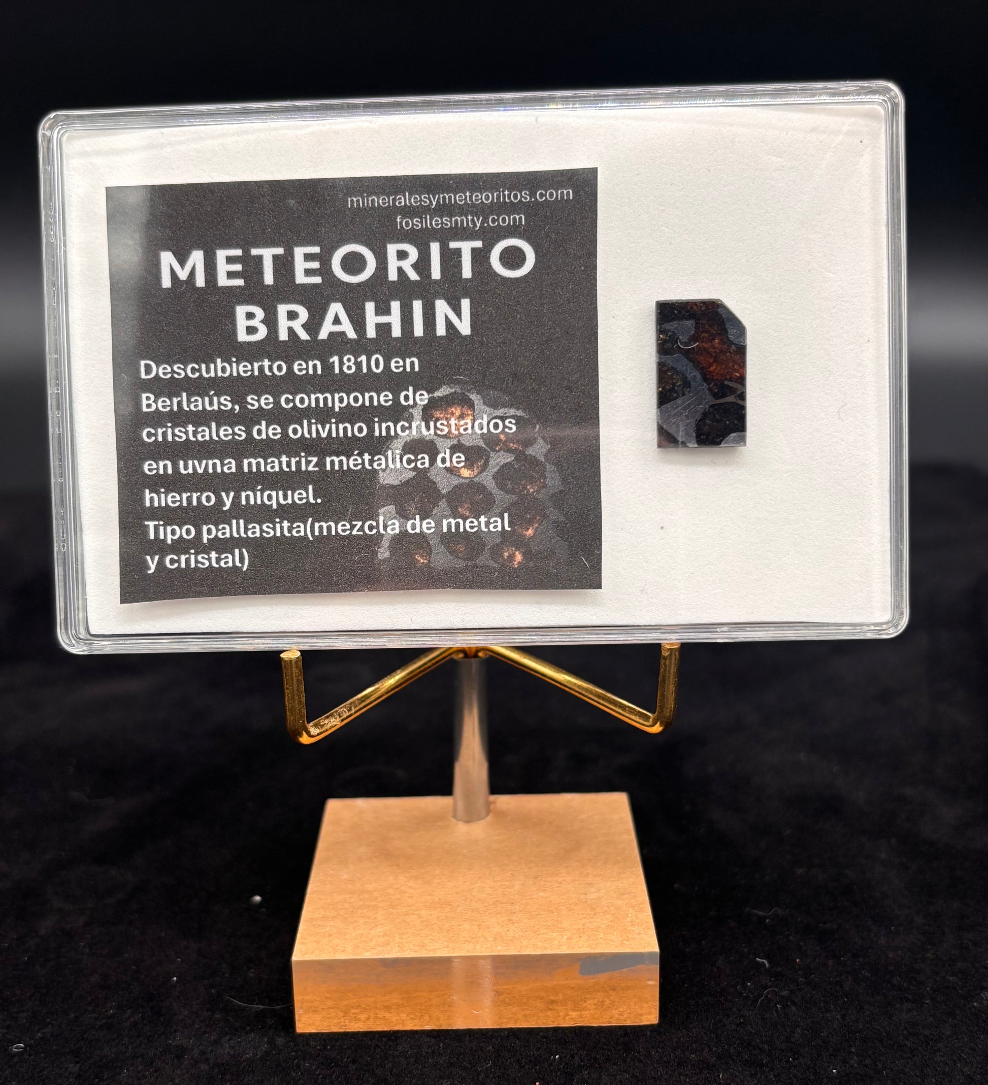El Brahin es un meteorito pallasita, una de las clases más bellas y raras que existen. Fue descubierto en Belarús en 1810. Se compone de cristales de olivino (peridoto) incrustados en una matriz metálica de hierro y níquel, lo que le da un aspecto translúcido y espectacular cuando se corta en láminas delgadas.