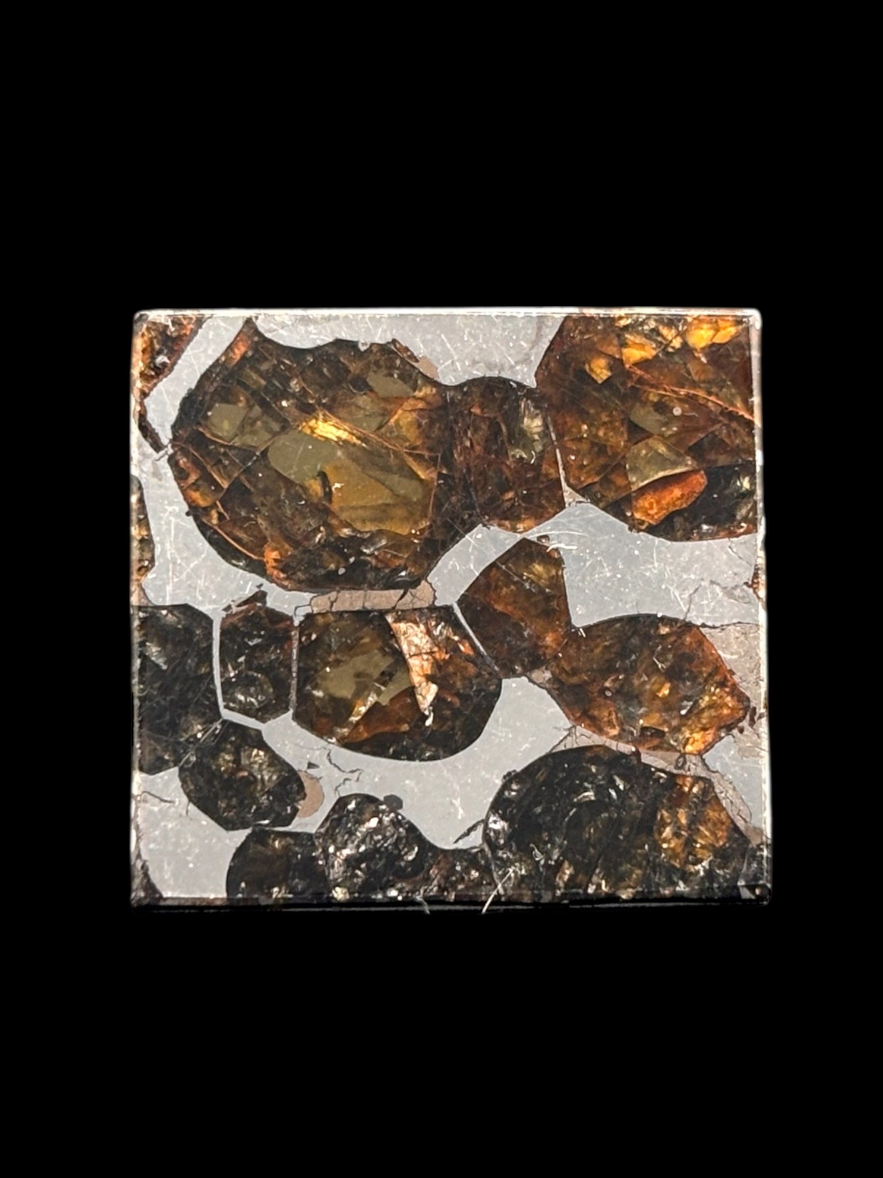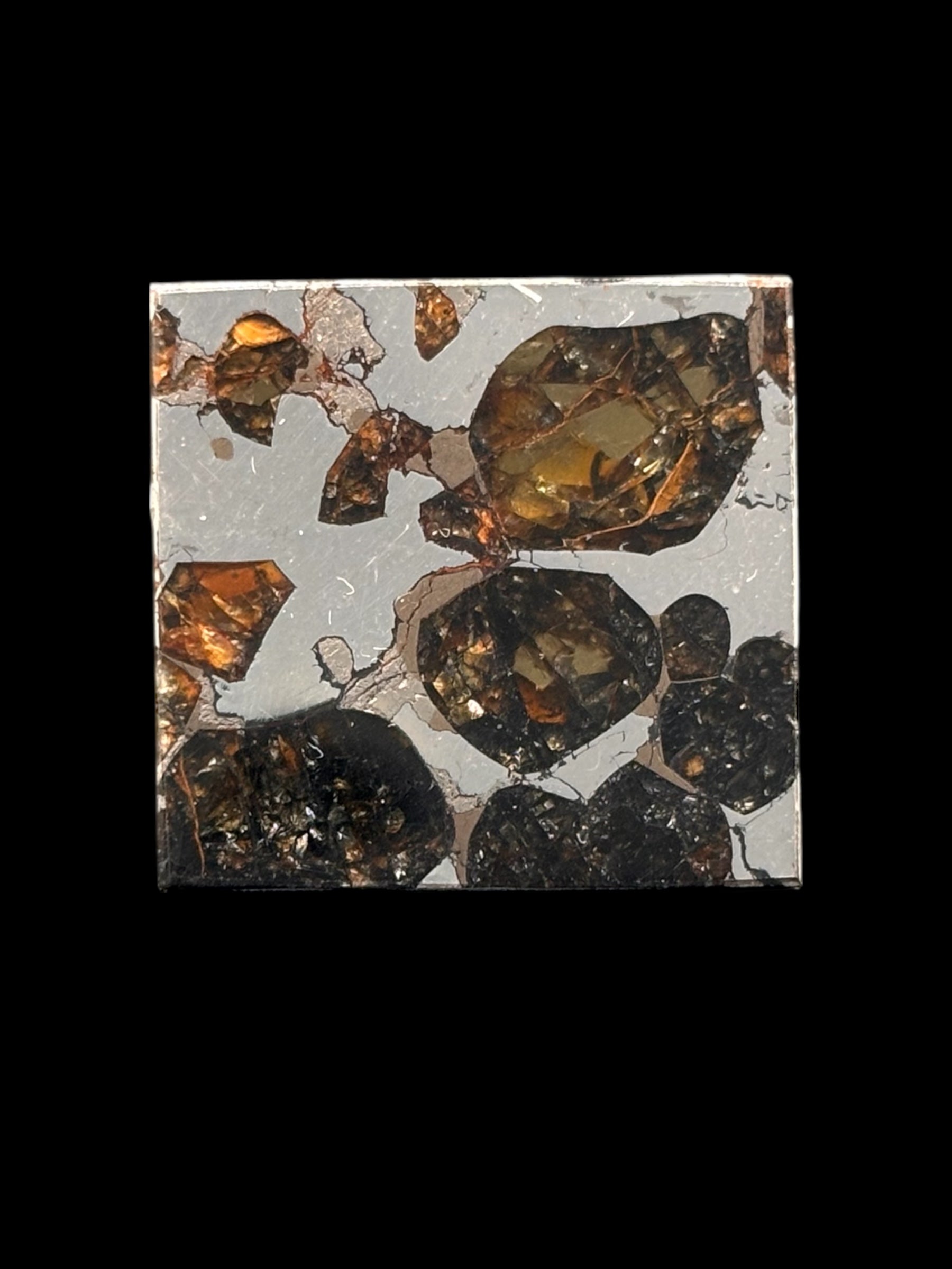 El Brahin es un meteorito pallasita, una de las clases más bellas y raras que existen. Fue descubierto en Belarús en 1810. Se compone de cristales de olivino (peridoto) incrustados en una matriz metálica de hierro y níquel, lo que le da un aspecto translúcido y espectacular cuando se corta en láminas delgadas.