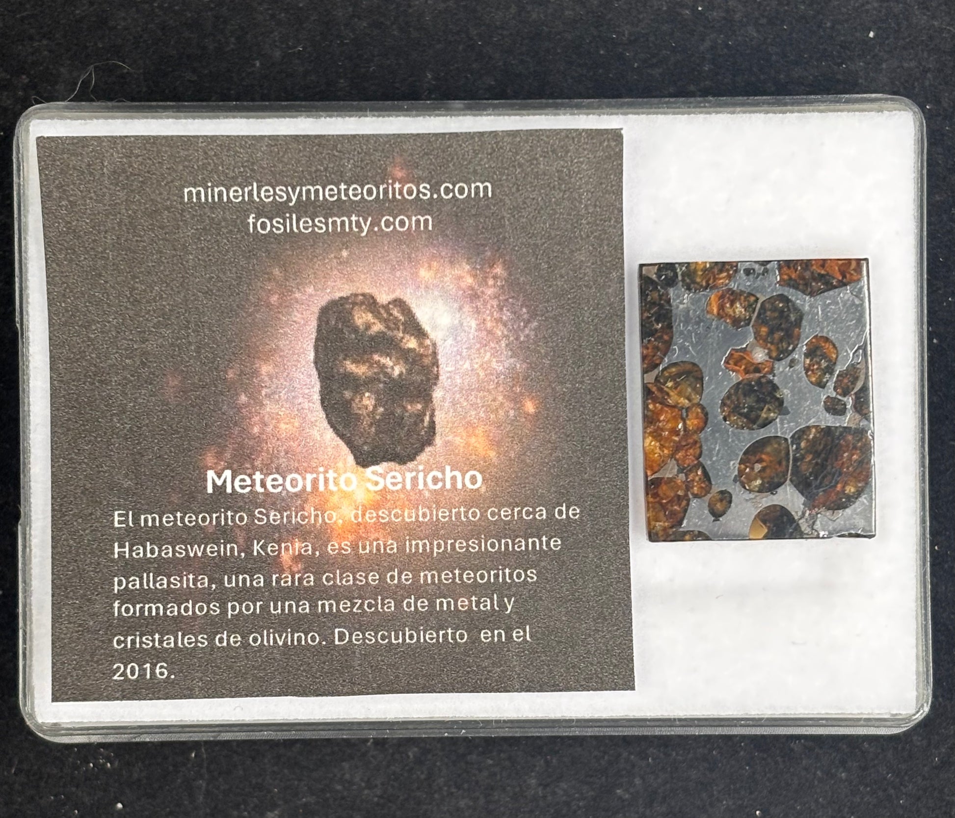 El meteorito Sericho, descubierto cerca de Habaswein, Kenia, es una impresionante pallasita, una rara clase de meteoritos formados por una mezcla de metal y cristales de olivino. Su belleza y composición única lo han convertido en un objeto de gran interés para coleccionistas, científicos y entusiastas de la astronomía.