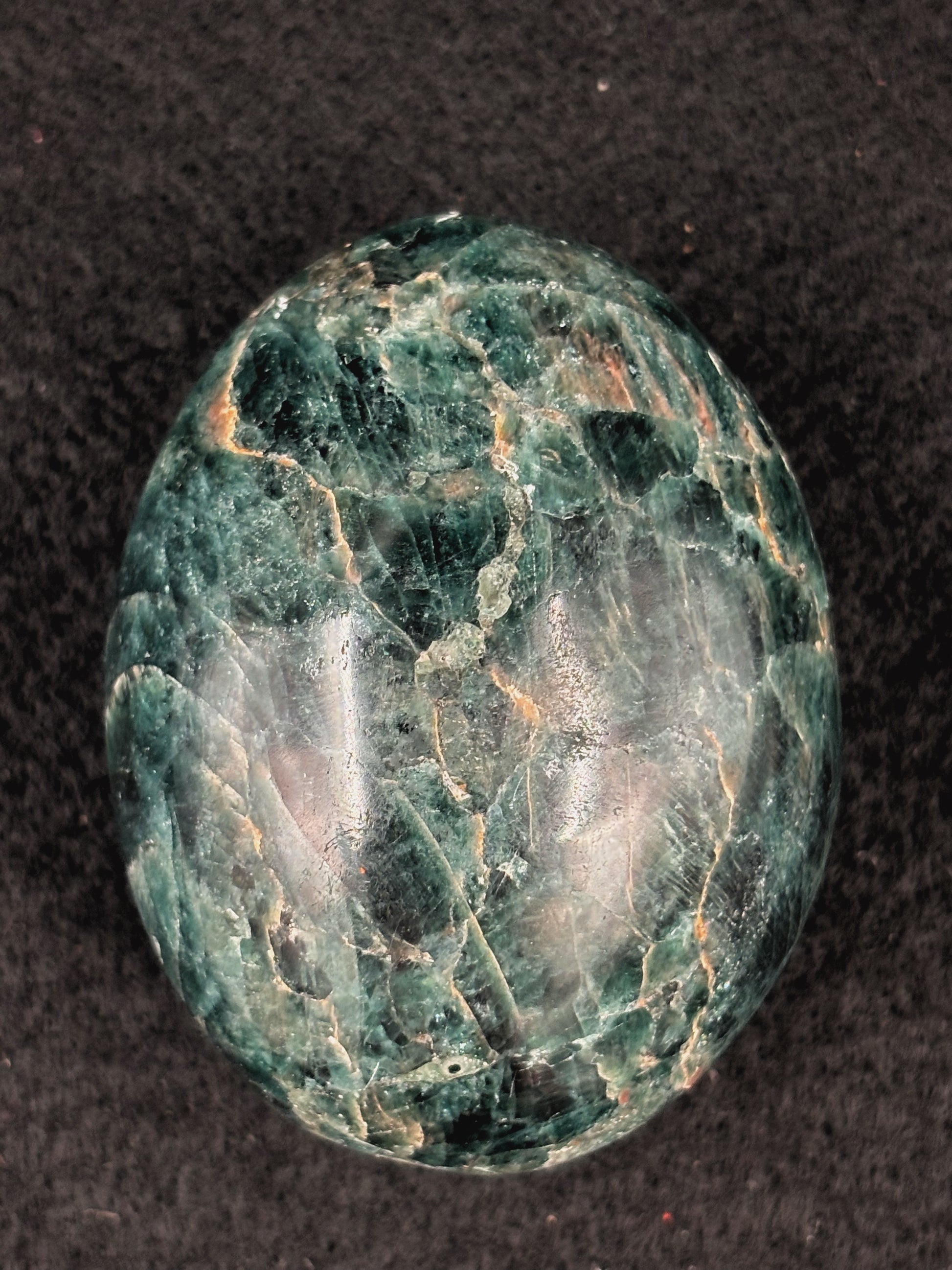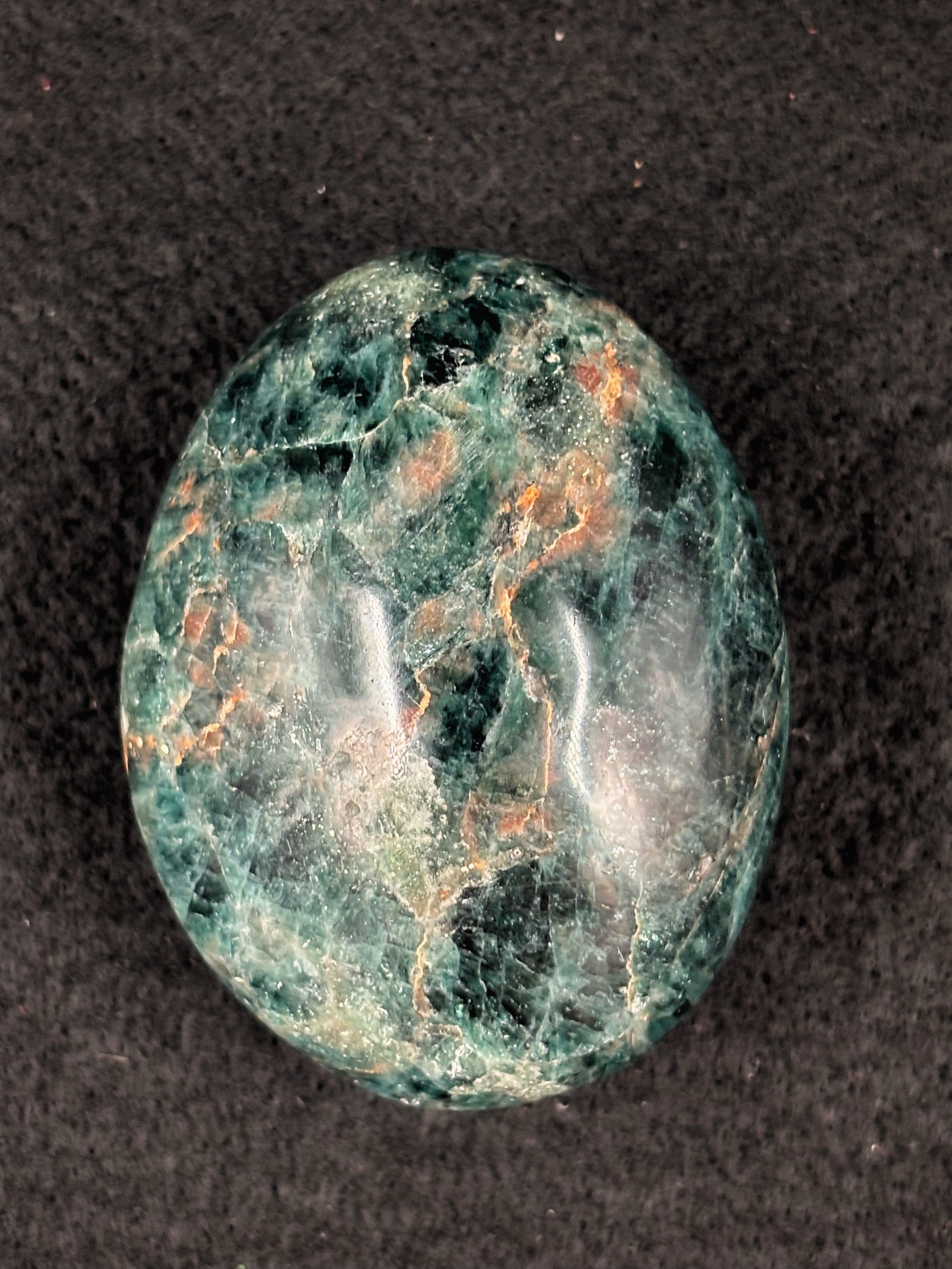 Descubre la energía vibrante de esta palma de apatito verde, una piedra semipreciosa reconocida por su intenso color verde azulado y sus delicadas vetas naturales. Su forma pulida y ergonómica la hace ideal para sostener durante la meditación o llevar como amuleto energético.