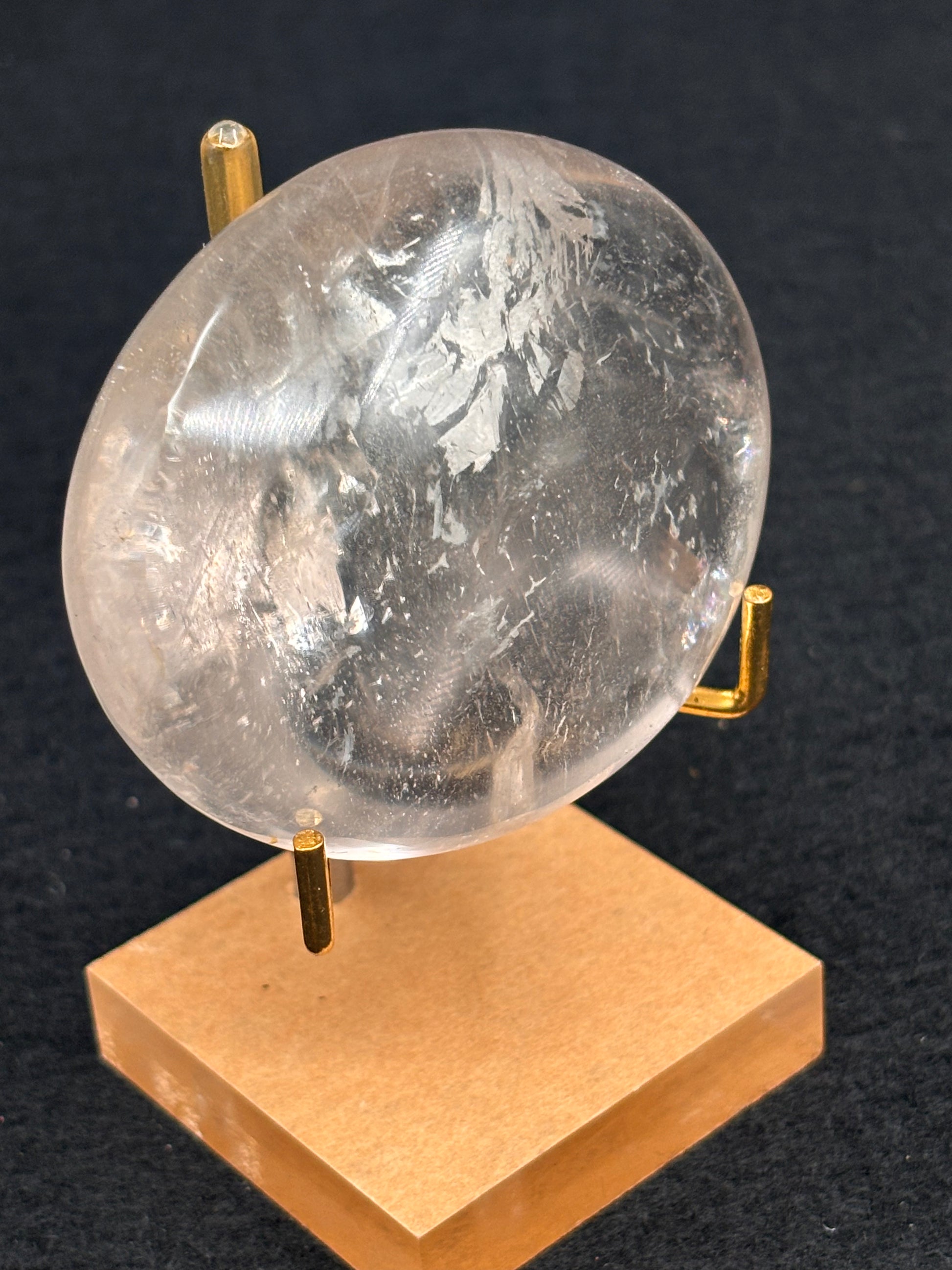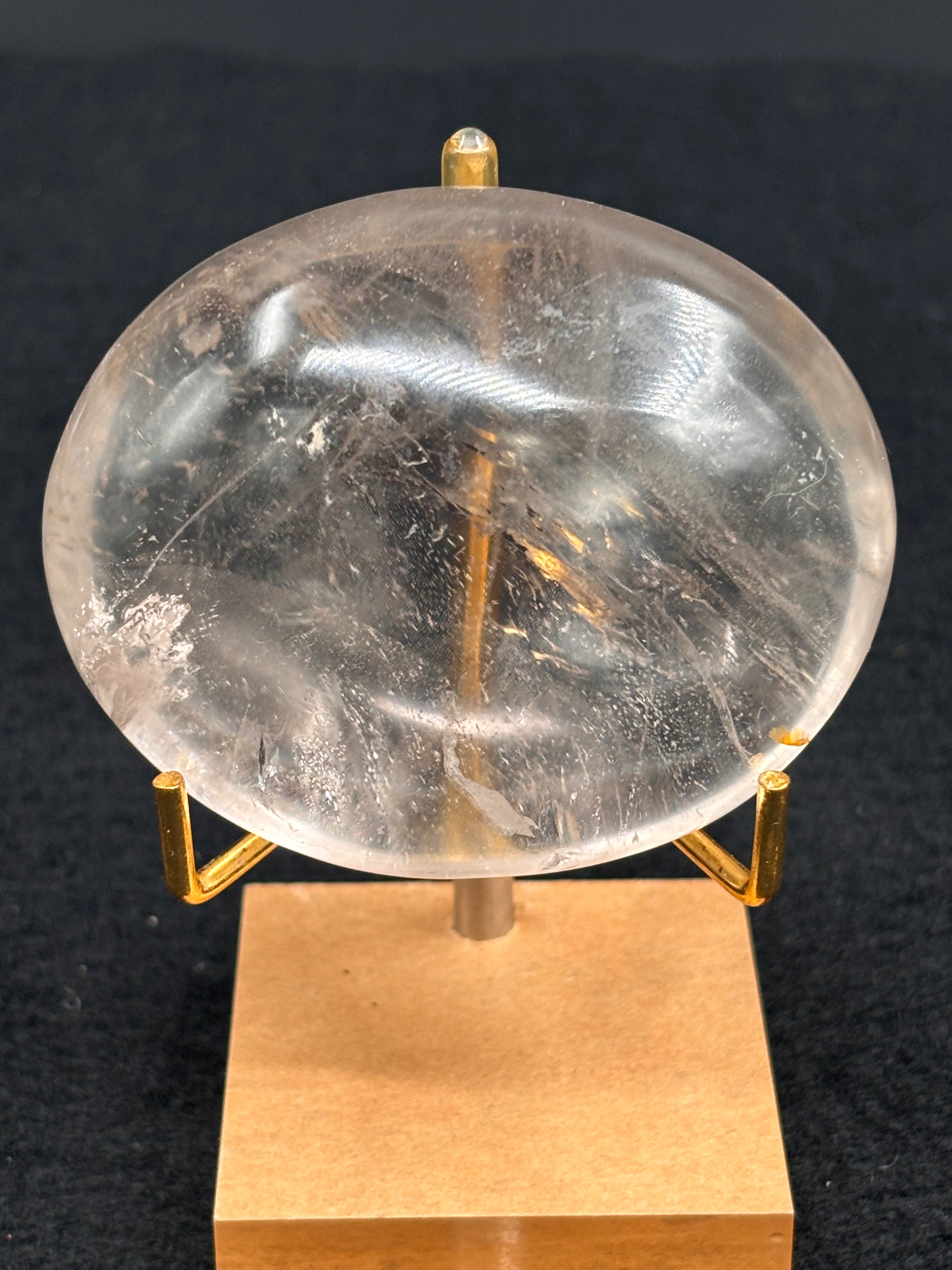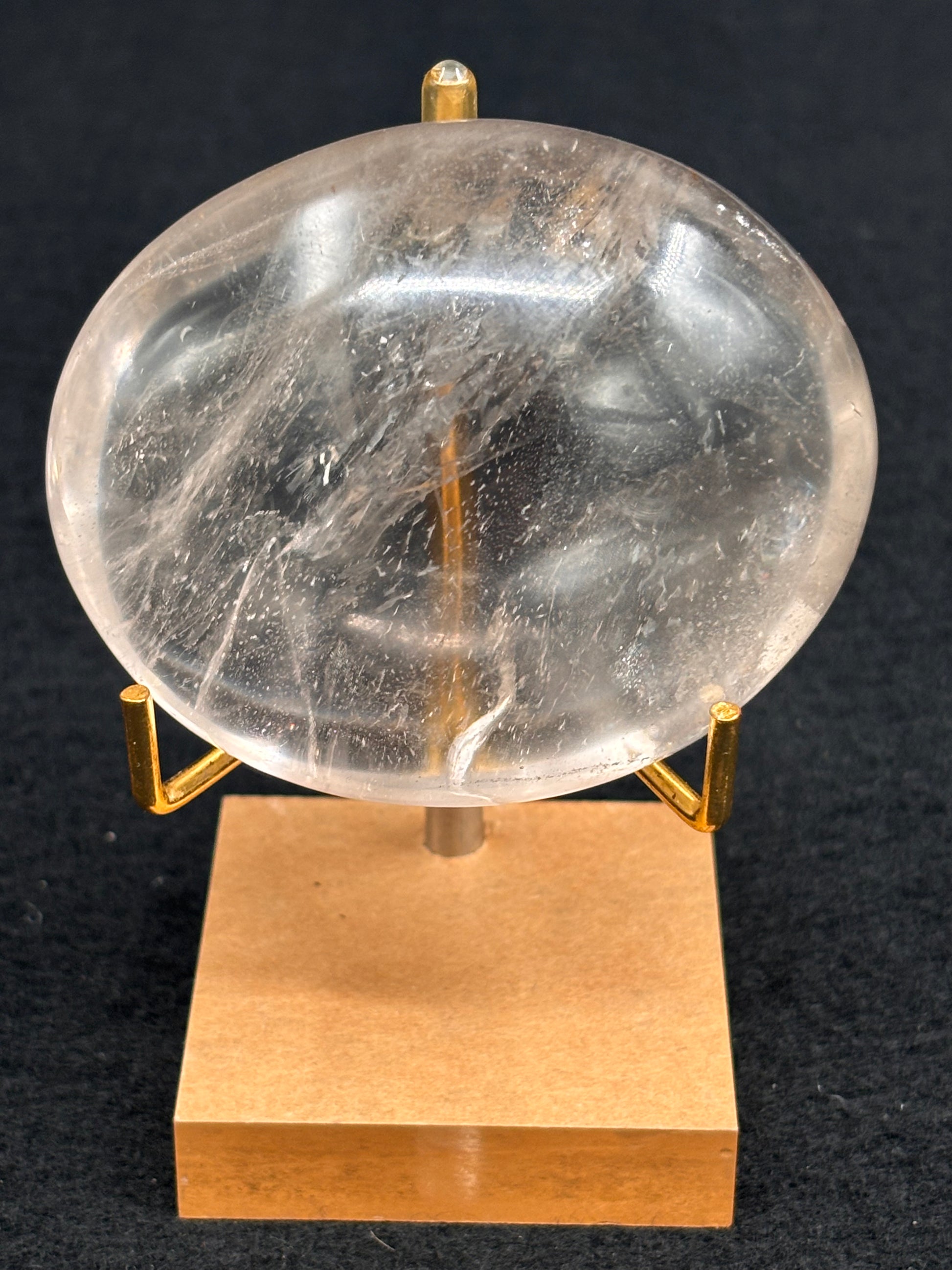 La palma de cuarzo blanco es una piedra pulida de forma ovalada, ideal para sostener en la mano. Se caracteriza por su apariencia translúcida o lechosa, con un brillo suave que refleja la luz de forma delicada.