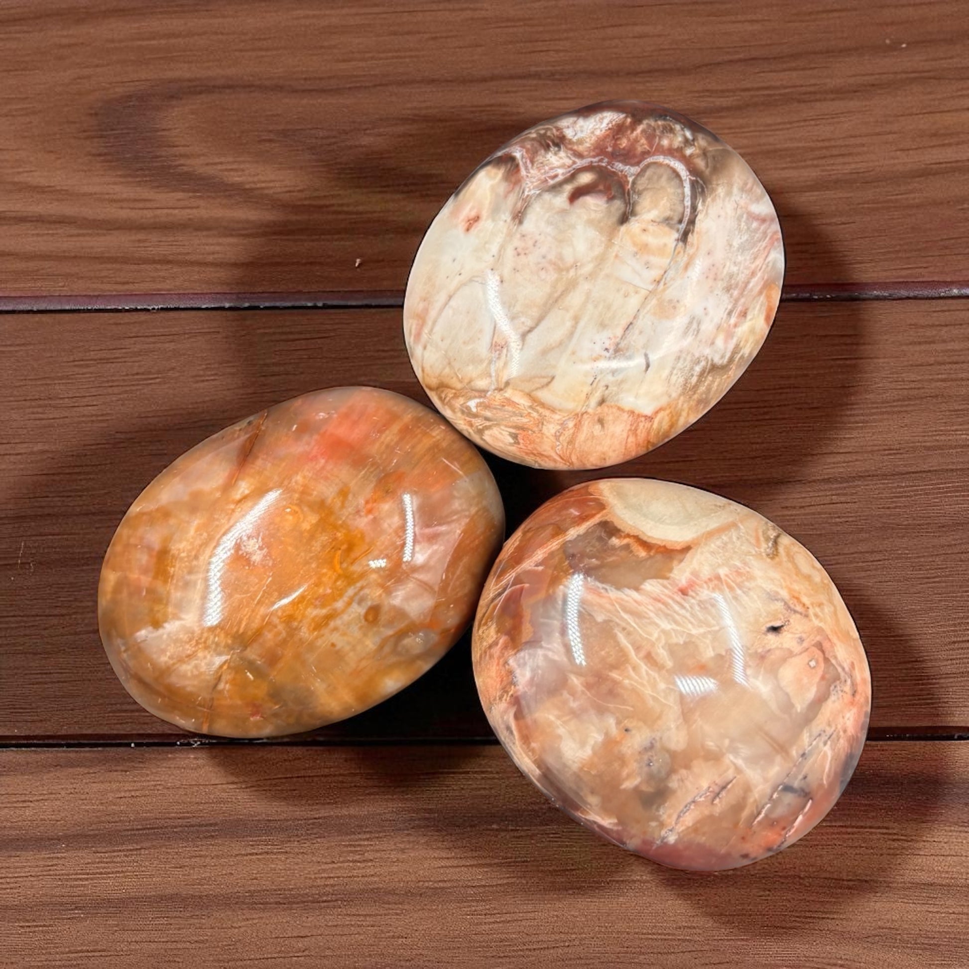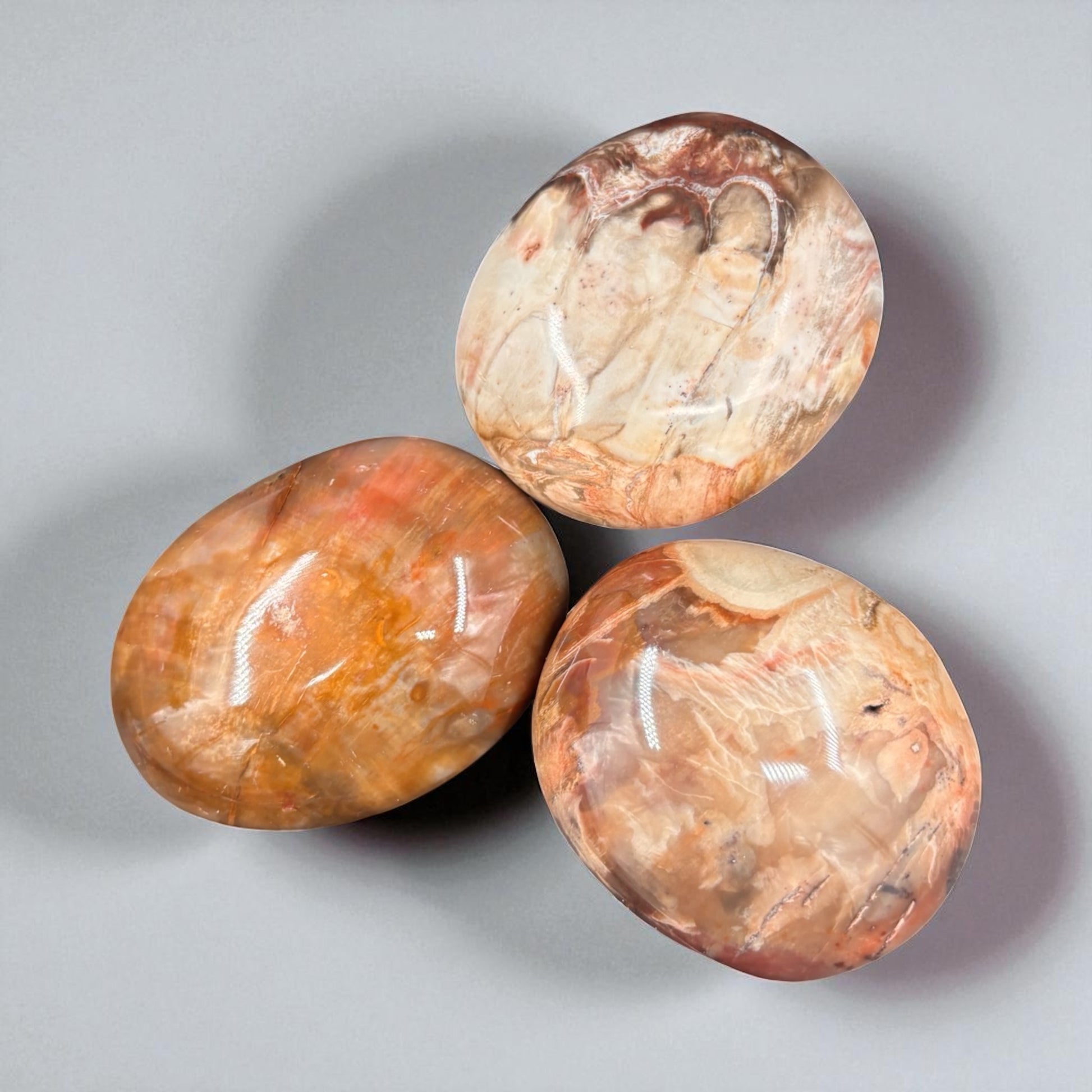La palma de madera fosilizada es una piedra pulida elaborada a partir de restos de madera que, con el paso de millones de años, se mineralizaron y se convirtieron en roca. Este proceso ocurre cuando la materia orgánica de la madera es reemplazada gradualmente por minerales como el cuarzo, manteniendo su estructura original.