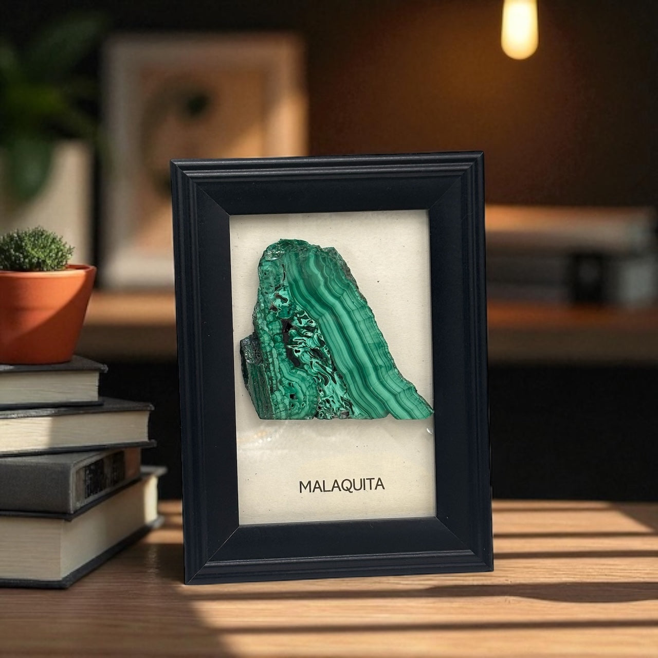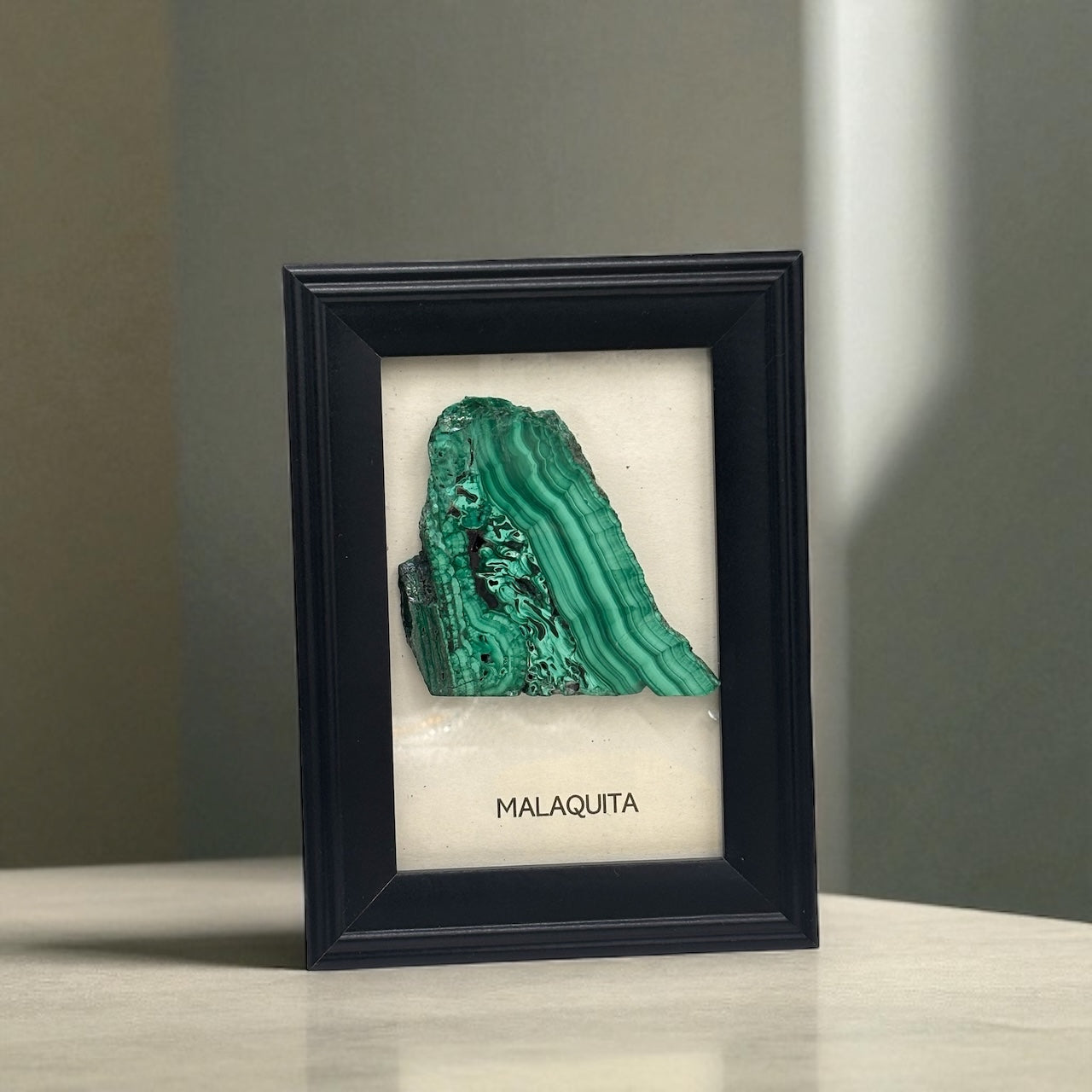 La malaquita es un mineral verde opaco, conocido por su característico color y patrones ondulados que varían entre tonos oscuros y claros de verde, constituido por carbonato de cobre y plata en la zona de oxidación de los depósitos de cobre , como resultado de su alteración.