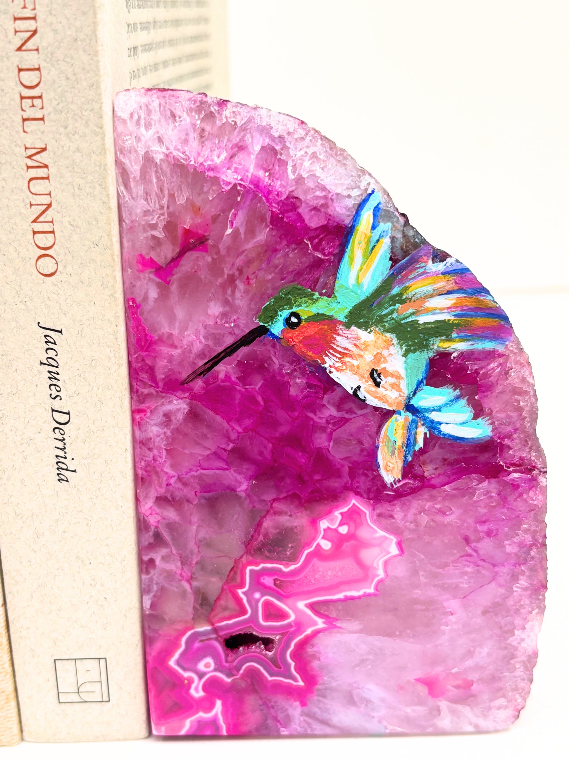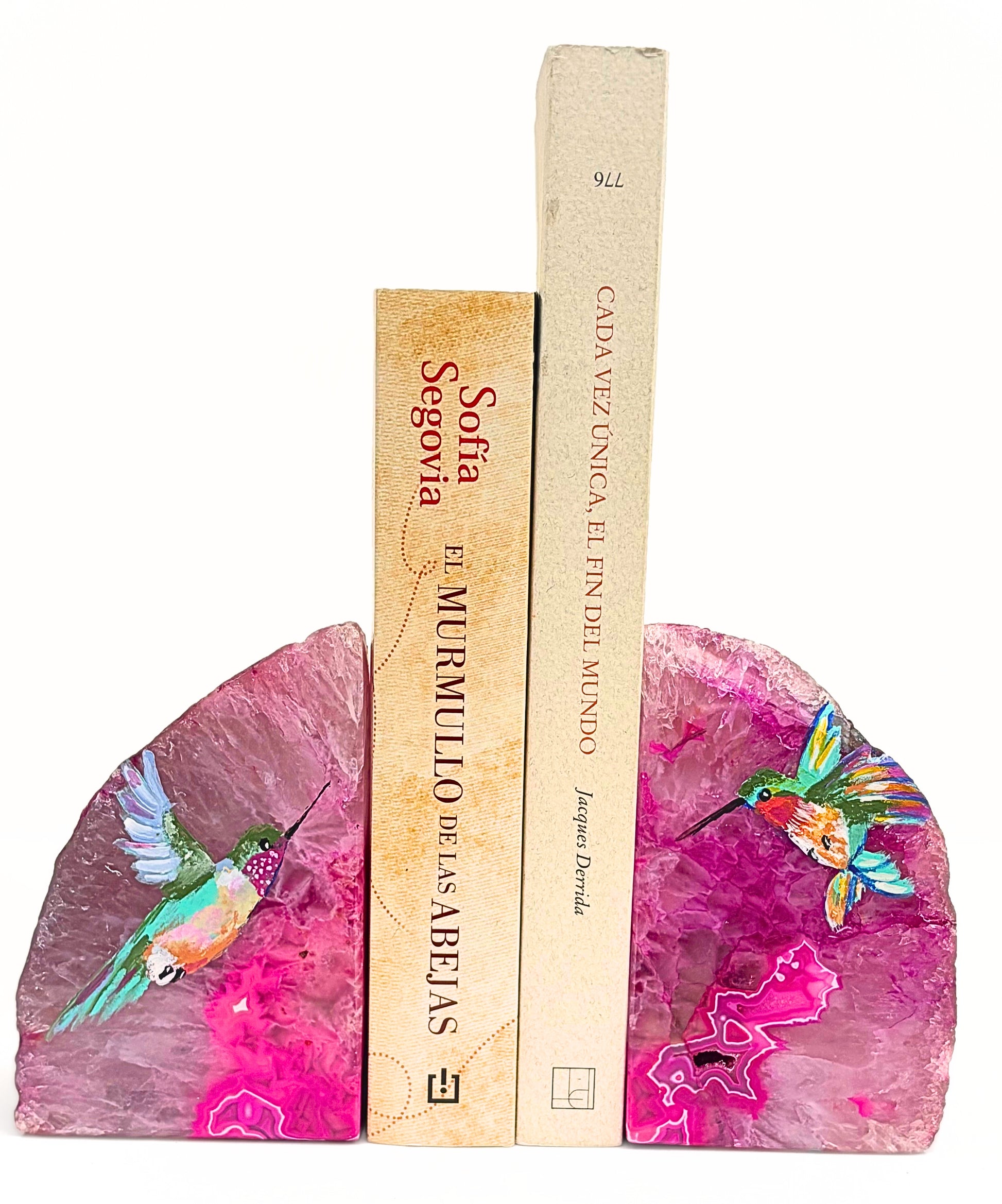 Agrega un toque de arte y naturaleza a tu espacio con este exclusivo separador de libros de ágata rosa, decorado a mano con delicados colibríes pintados sobre la superficie de la piedra.